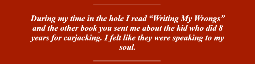 During my time in the hole I read “Writing My Wrongs” and the other book you sent me about the kid who did 8 years for carjacking. I felt like they were speaking to my soul. It’s like they felt my pain that we endure in here every day. And just to see them stay down until they come up is inspiring.